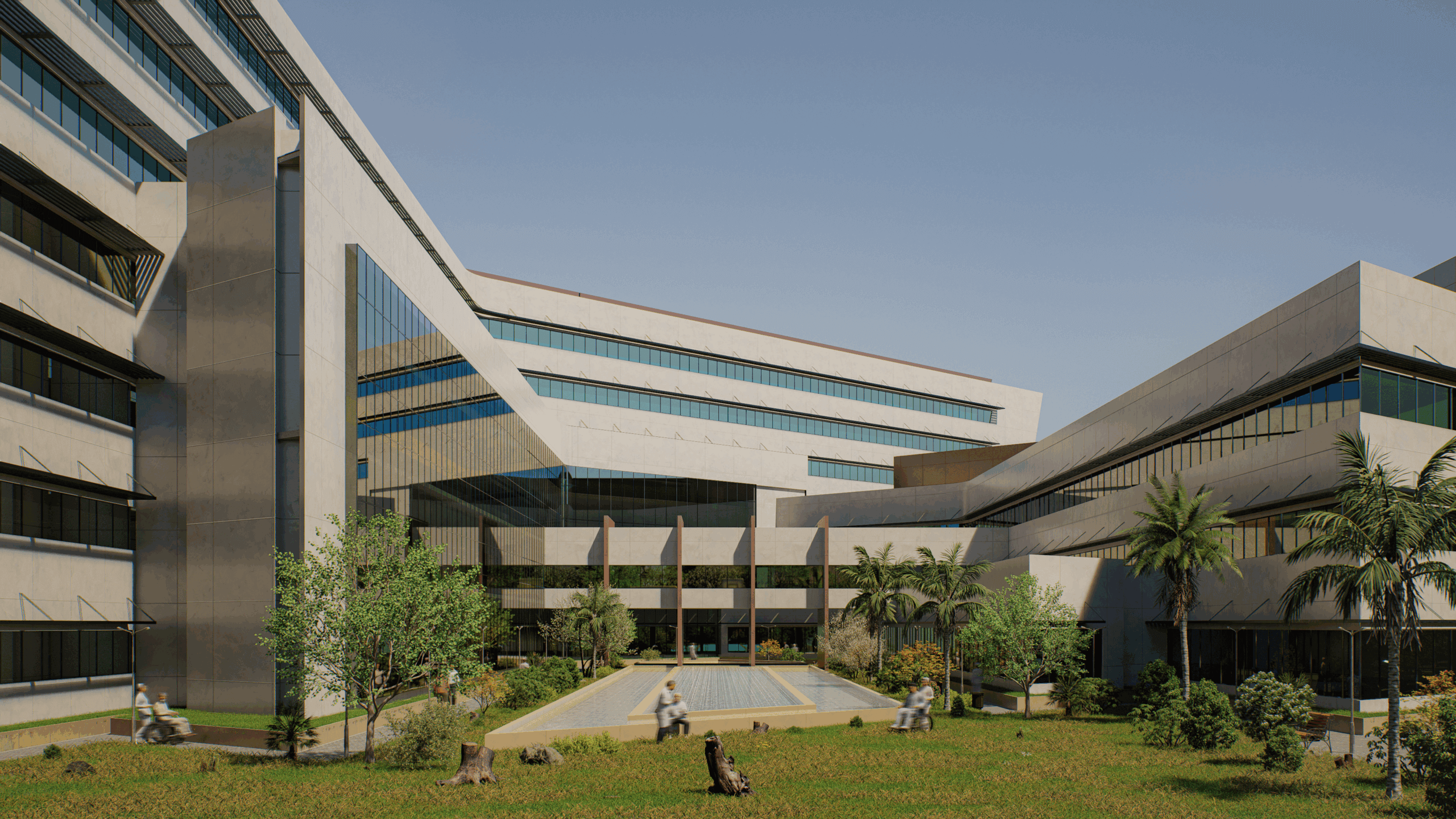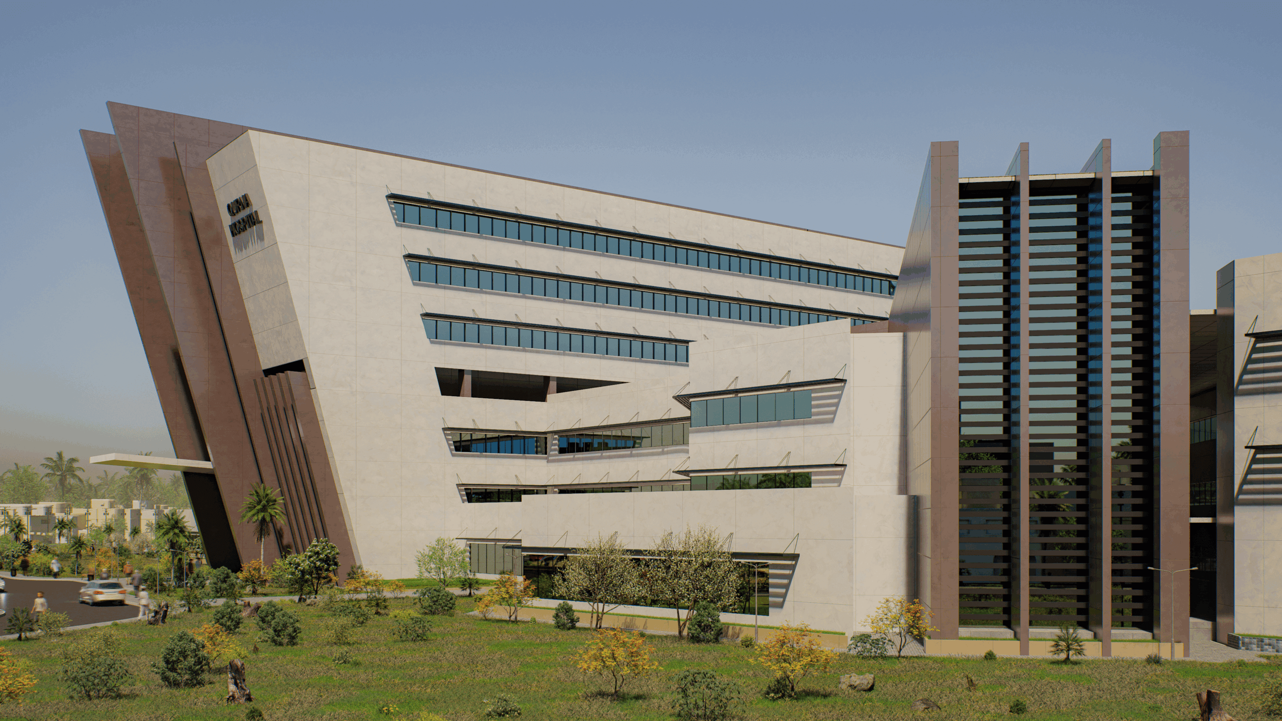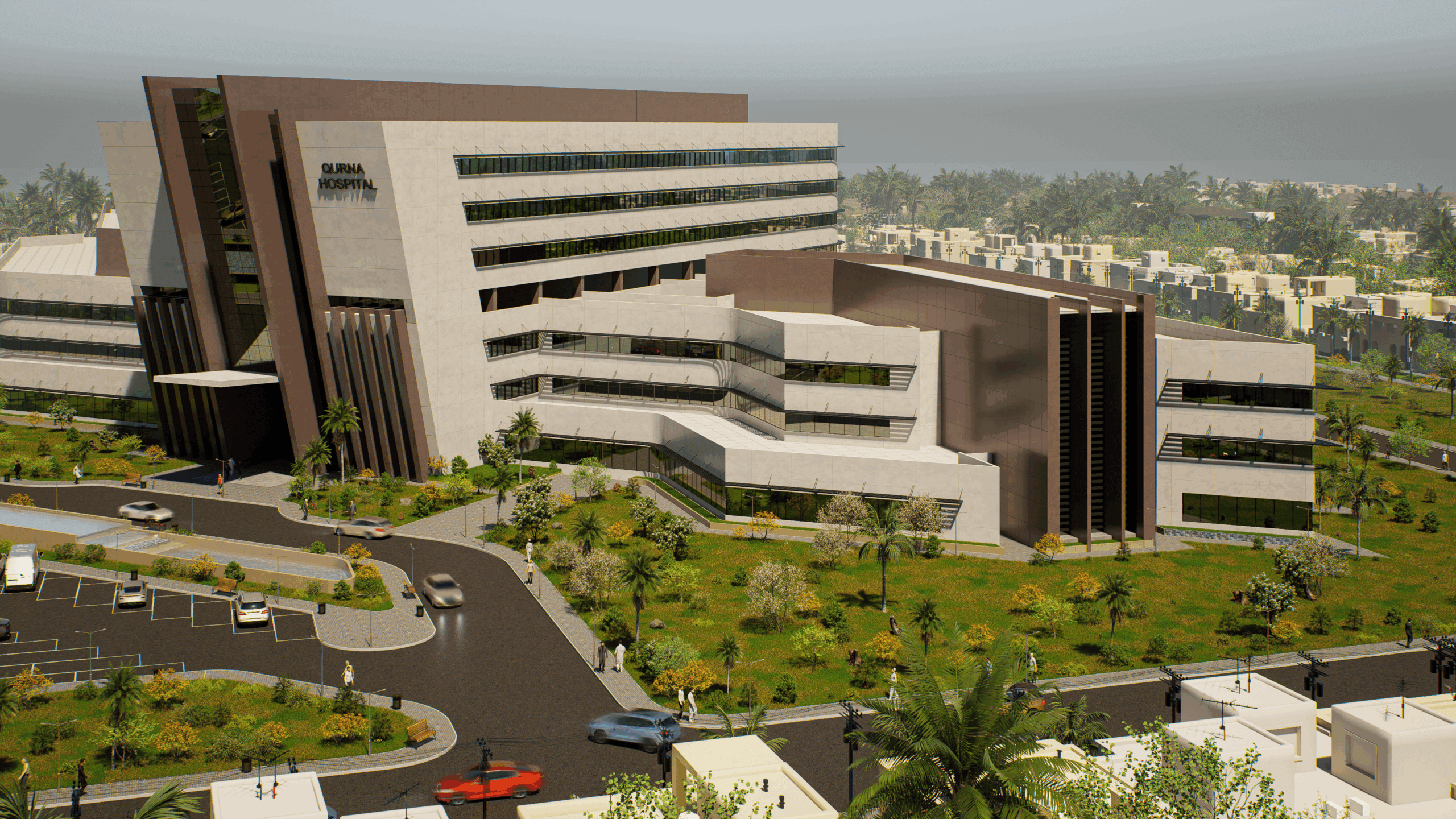 A government hospital with a capacity of 325 beds, its functional requirements are distributed as follows: Ground floor: The main entrance, the outpatient clinics department, the emergency department, the day surgery unit, in addition to the dialysis unit, the radiology and diagnostics department, as well as a cafeteria, a conference hall, and the administrative section. First floor: laboratories, administration, pharmacy, and part of the outpatient clinic department, in addition to the medical records unit and the endoscopy department. Second floor: surgical department, gynecology & obstetric, central sterilization unit, N.I.C.U. (incubators), and intensive care unit. Third floor: service activities located above the operations floor. The three typical floor of wards. Basement: workshops, housekeeping department, waste department, mortuary, laundry, main kitchen and stores.